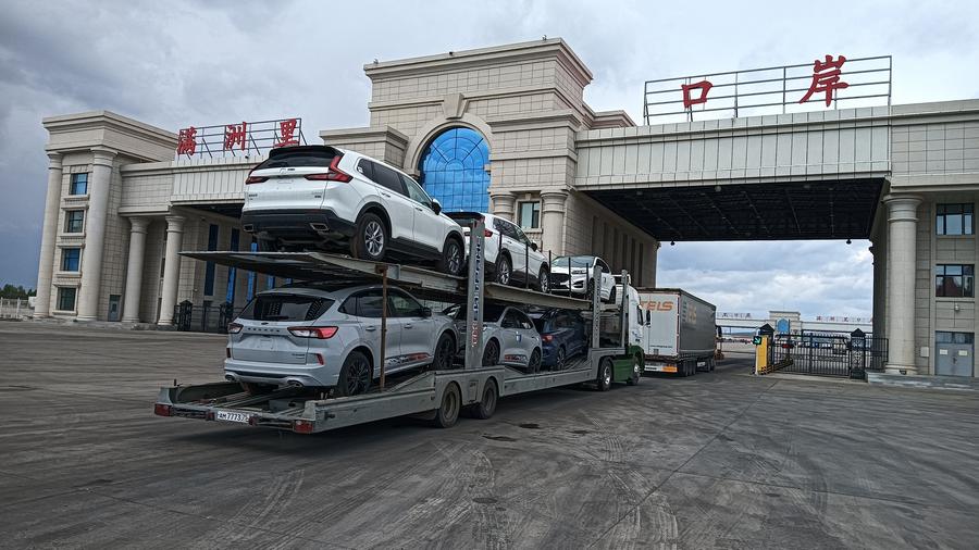 3 июля 2024 года, партия китайских подержанных автомобилей экспортируется через автомобильный пункт пропуска Маньчжоули. /Фото: Синьхуа/