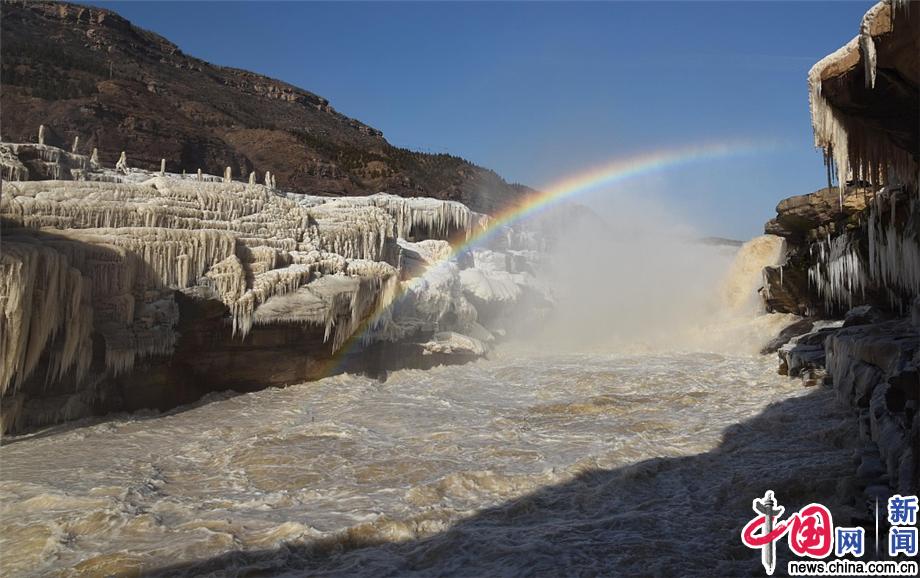 14 декабря 2020 года, город Линьфэнь, провинция Шаньси, туристы наслаждаются великолепным пейзажем ледяного массива и радуги у водопада Хукоу на реке Хуанхэ. Поскольку температура продолжает падать, водопад Хукоу на реке Хуанхэ на стыке уезда Цзисянь в провинции Шаньси и уезда Ичуань в провинции Шэньси замёрз. В небе над водопадом - красочная радуга. Красивый пейзаж привлекает множество туристов.