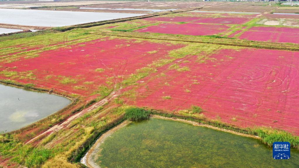 В уезде Гуаньюнь провинции Цзянсу артемизия галодендрон постепенно краснеет, становясь прекрасной на отмели