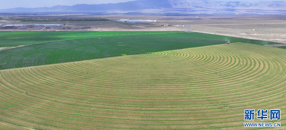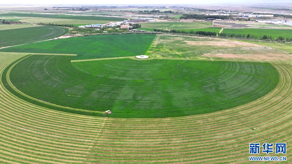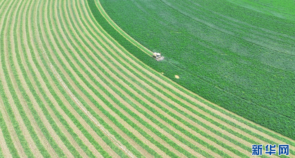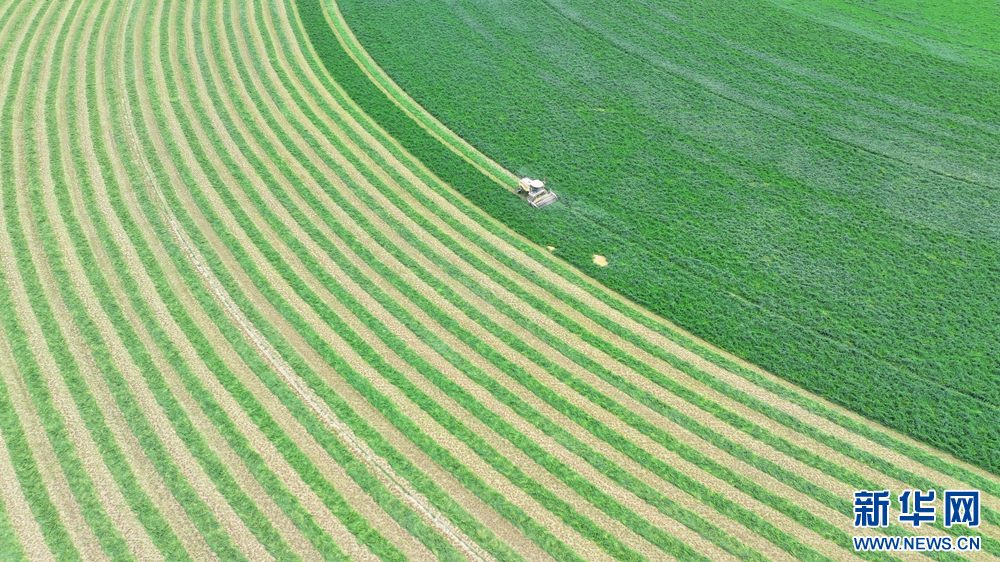Наступил сезон первого сбора урожая люцерны посевной, и в индустриальном парке Миньюэ в городе Чжанъе провинции Ганьсу рабочие на комбайнах собирают первые побеги.