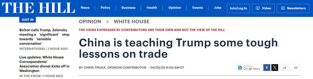 25 апреля на веб-сайте американского издания The Hill была опубликована обзорная статья, в которой говорилось, что торговая стратегия США, направленная на то, чтобы с помощью высоких тарифов заставить Китай подчиниться, терпит неудачу с угрожающей скоростью. Китай преподал Трампу суровый урок по торговым вопросам. Эта торговая война не только не смогла поколебать Китай, но, напротив, пробудила в нем новое чувство национального долга.