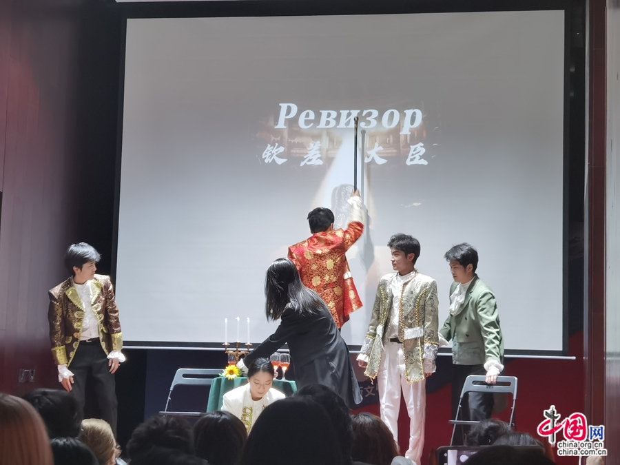 Фото: студенты из Пекинского университета иностранных языков выступают с театральной постановкой «Ревизор».