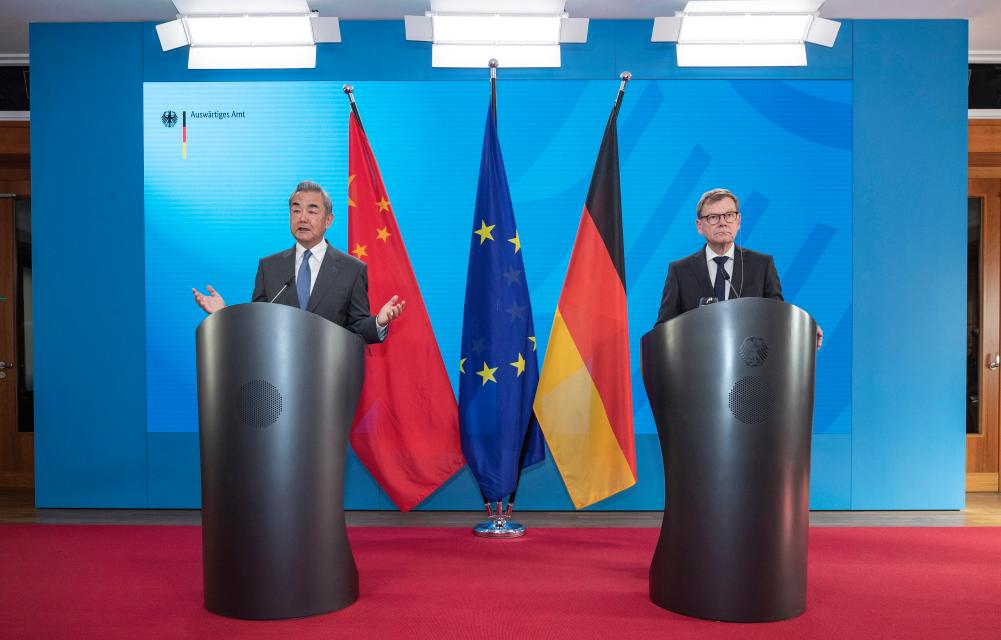 3 июля, Берлин. Член Политбюро ЦК КПК, министр иностранных дел КНР Ван И и глава МИД Германии Йоханн Вадефуль выступают на совместной пресс-конференции. /Фото: Синьхуа/