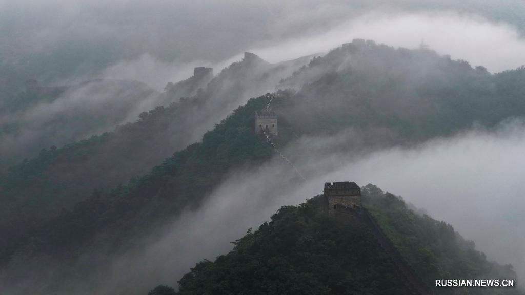 Чэндэ /пров. Хэбэй/, 6 июля /Синьхуа/ -- Участок Великой Китайской стены Цзиньшаньлин в уезде Луаньпин города Чэндэ провинции Хэйбэй /Северный Китай/ в субботу утром был окутан облаками и туманом.