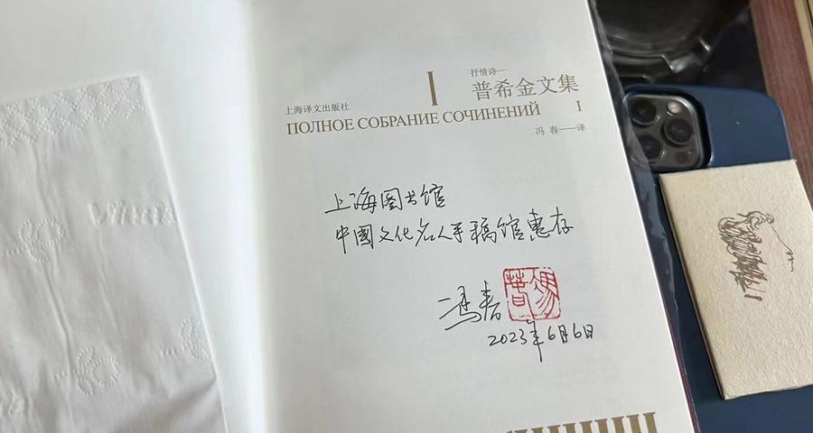 6 июня 2023 года, титульный лист одного из 12 томов полного собрания сочинений Александра Пушкина на китайском языке, пожертвованного китайским переводчиком Фэн Чунем в Библиотеку рукописей знаменитых культурных деятелей Китая при Шанхайской библиотеке. /Фото: Синьхуа/