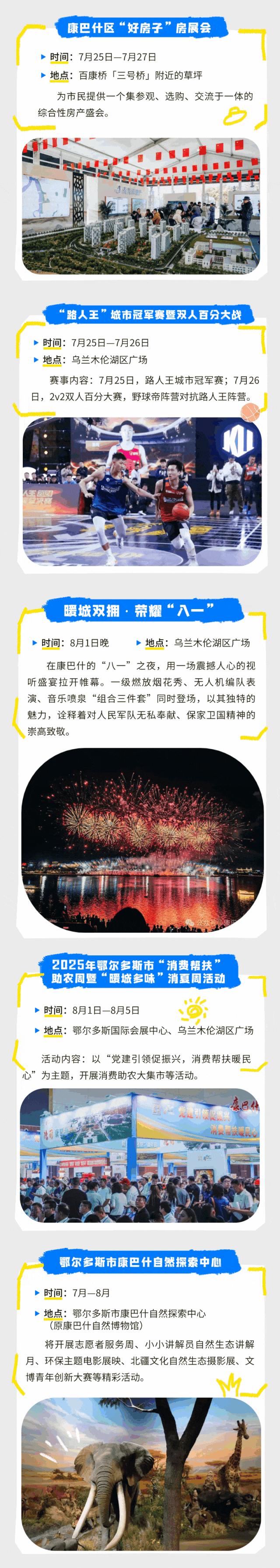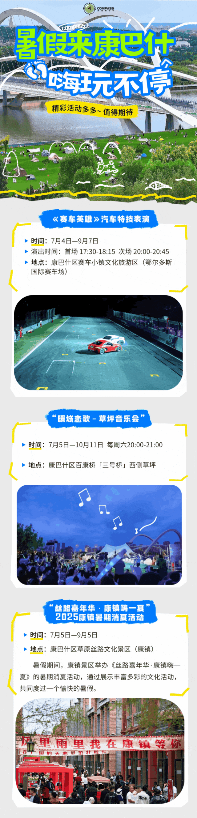 Хотите ли найти интересное место для летних каникул? Приезжайте в район Канбаши, Ордос, Внутренняя Монголия! Фейерверки, дроны, музыкальный фонтан - «комплект из трех частей» появится одновременно. Автомобильные трюки, концерты на лужайке, продажа автомобилей на новых источниках энергии, субсидии на покупку жилья и другие сюрпризы, от культурных представлений до потребительских льгот... Просмотрите полный гид по развлечениям, который обеспечит Вам веселые летние каникулы!