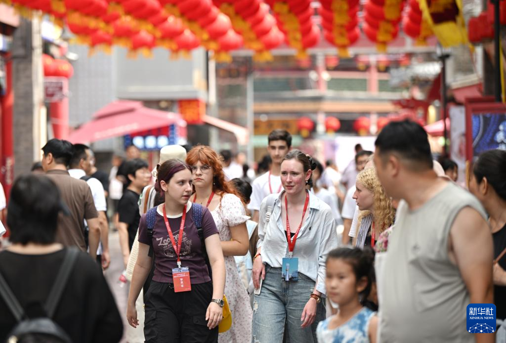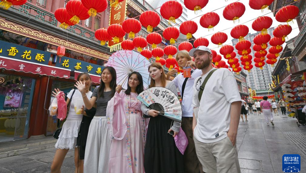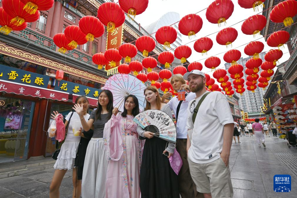 14 августа 100 студентов из России, Казахстана, Узбекистана и других стран-членов Шанхайской организации сотрудничества посетили Древнюю культурную улицу в Тяньцзине, чтобы познакомиться с очарованием традиционной китайской культуры. Фото журналиста информгентства «Синьхуа».