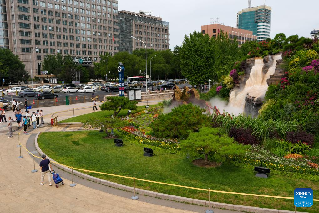 Пекин, 27 августа /Синьхуа/ -- Оформление цветочных композиций завершилось на площади Тяньаньмэнь и проспекте Чанъаньцзе в центре Пекина в преддверии масштабного военного парада в честь Дня Победы, запланированного на начало сентября.