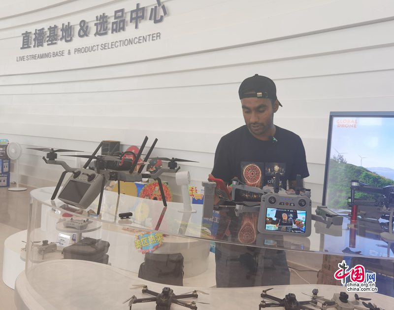 На фото: В промышленном парке трансграничной электронной коммерции Китая (г. Эчжоу) пакистанец Абдуллах продает на стриминге дроны.