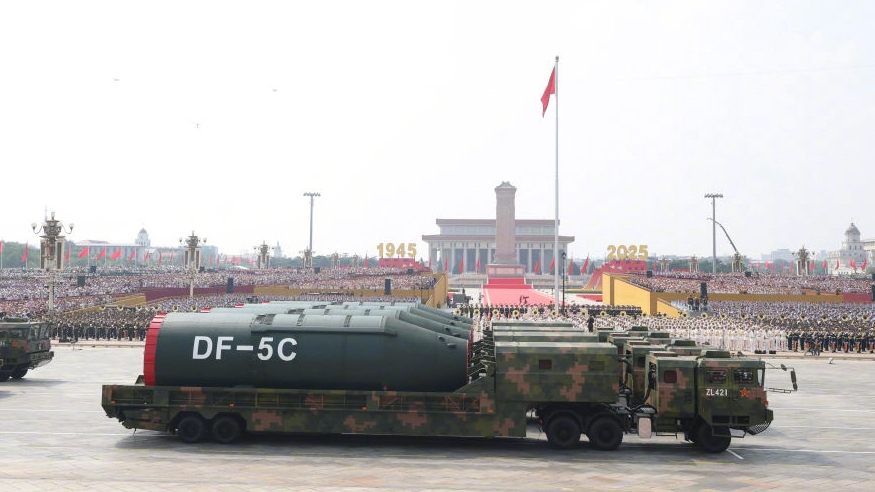 Пекин, 3 сентября /Синьхуа/ -- Межконтинентальные стратегические ядерные ракеты с жидким топливом "Дунфэн-5C", способные нанести удары по любым объектам на всей планете, проехали через площадь Тяньаньмэнь в среду на параде в честь Дня Победы. -0-
