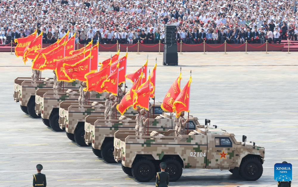 Расчет боевых знамен, состоящий из 80 почетных знамен героических воинских частей, участвовавших в Войне сопротивления китайского народа японским захватчикам, проехал мимо площади Тяньаньмэнь, подчеркивая позицию Китая как первой страны, поднявшейся против фашистской агрессии и ведущей самое продолжительное сопротивление с 1931 года.
