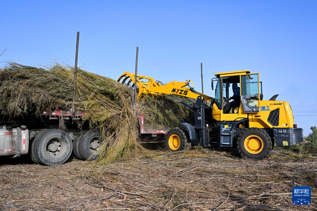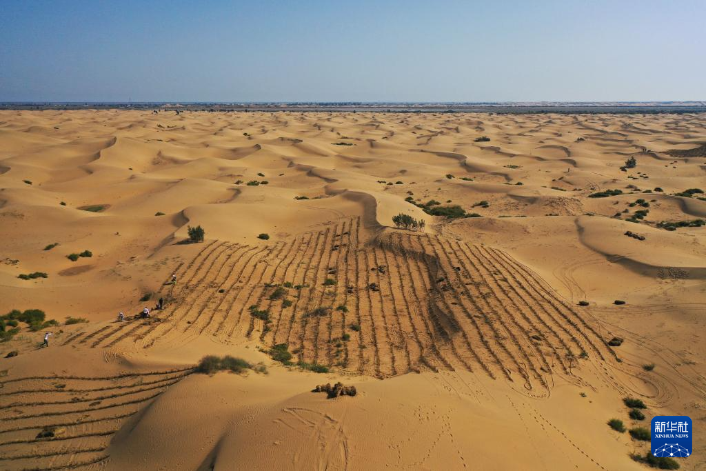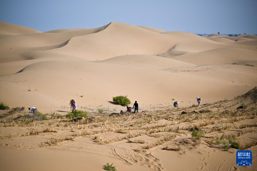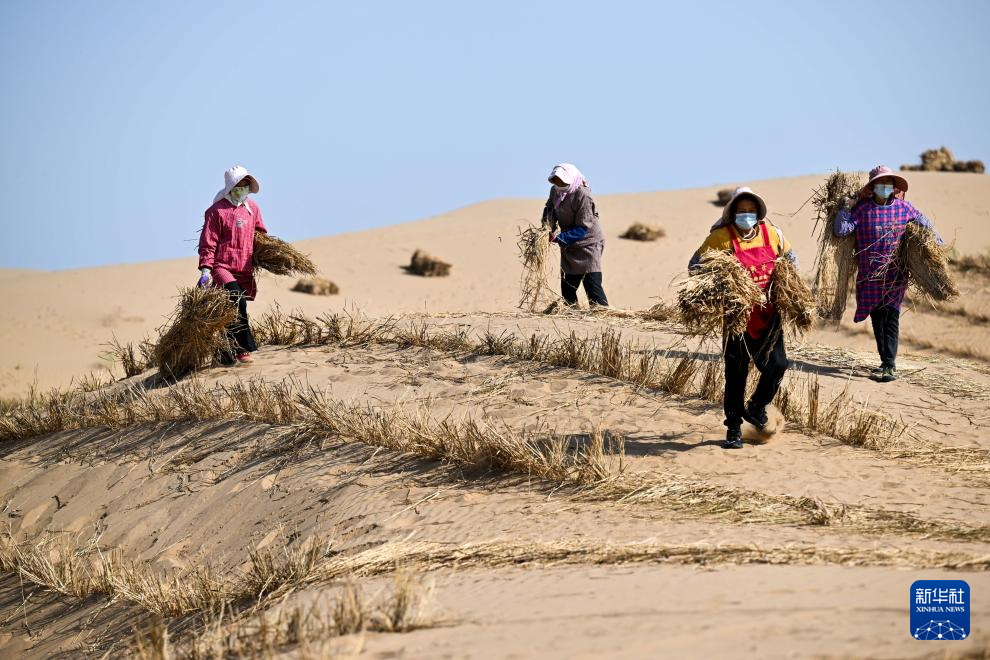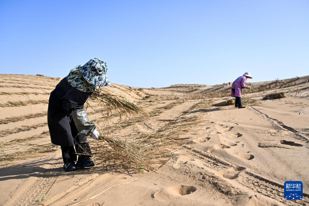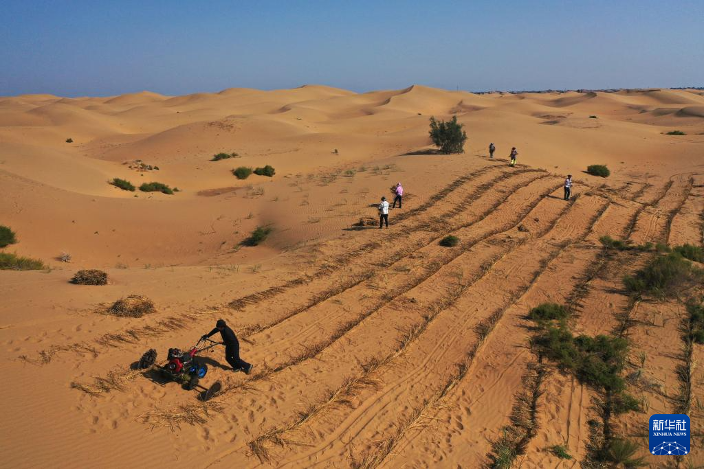 Осенью в пустыне Кузупчи, расположенной на территории хошуна Хангин-Ци города Ордос автономного района Внутренняя Монголия, рабочие заняты мерами по борьбе с опустыниванием. В последние годы хошун Хангин-Ци последовательно продвигает работу по предотвращению деградации земель, реализуя мноежство проектов по борьбе с опустыниванием и способствуя улучшению окружающей среды в пустыне Кузупчи. Фото корреспондента информационного агентства «Синьхуа» Ли Чжипэн.