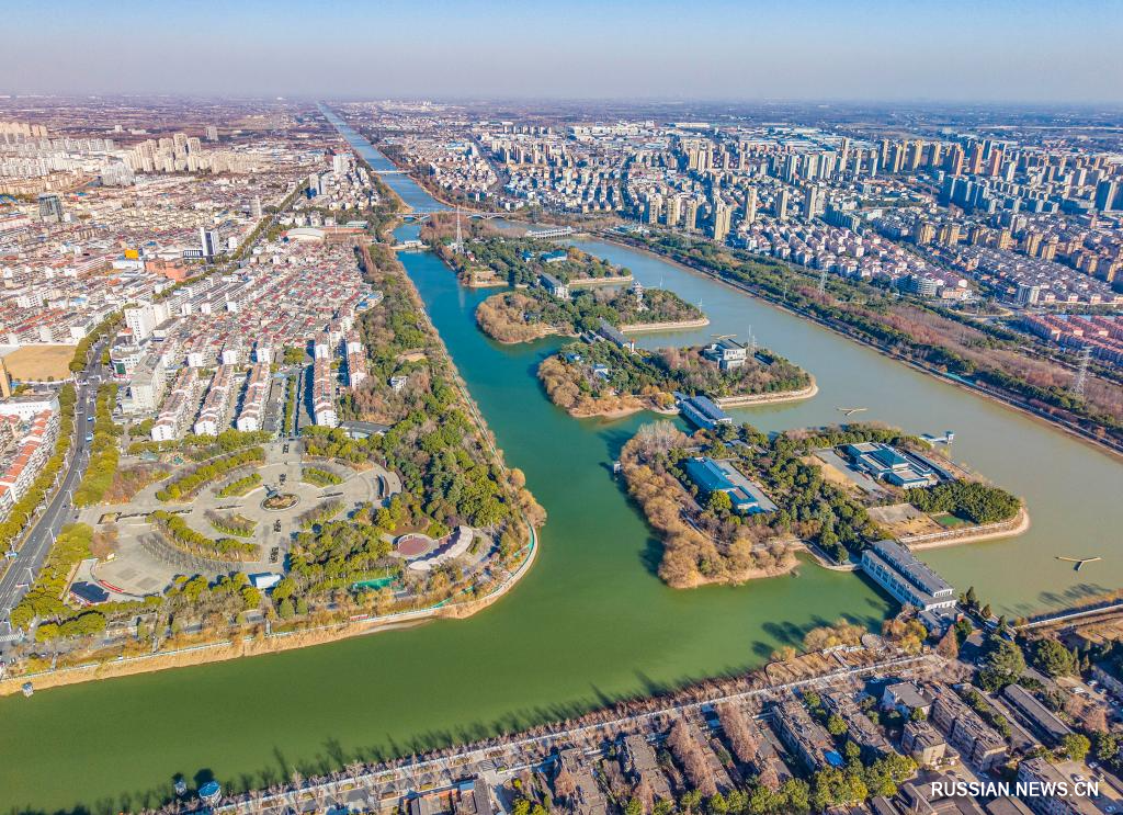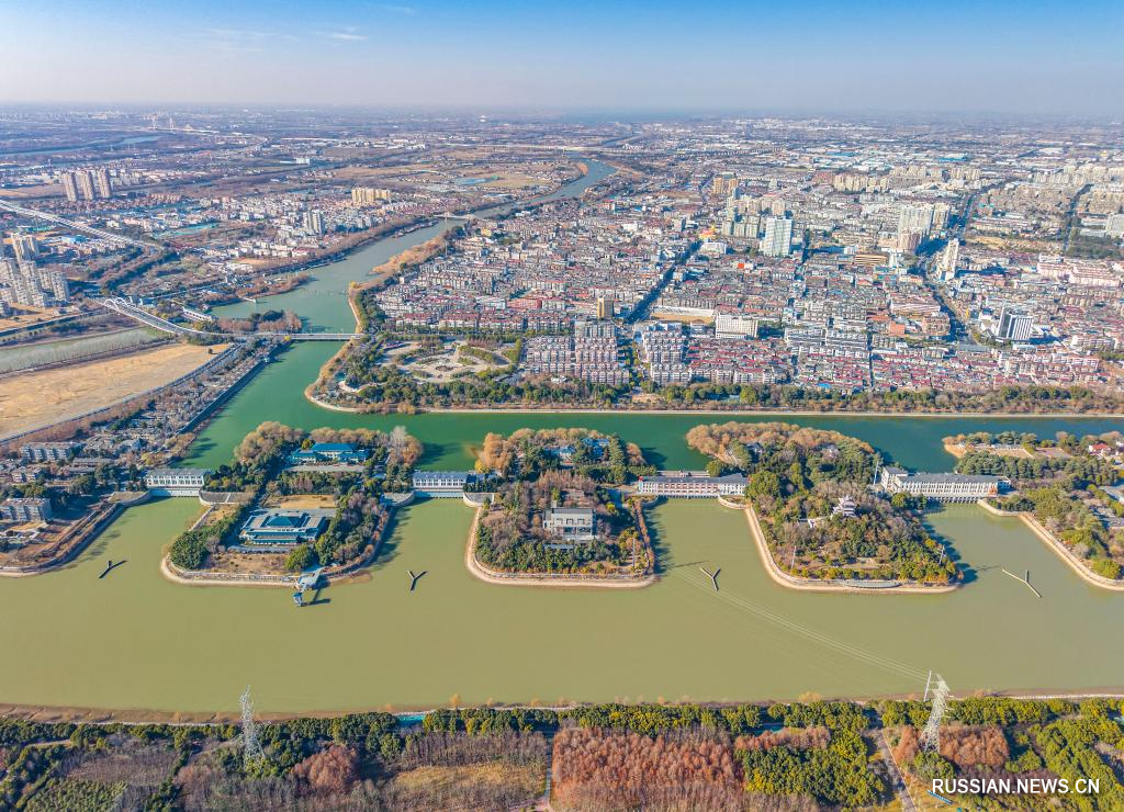 На фотографии, сделанной дроном с высоты птичьего полета, запечатлен гидроузел Цзянду в одноименном районе города Янчжоу провинции Цзянсу на востоке Китая, расположенный в начале восточного маршрута китайского мегапроекта.