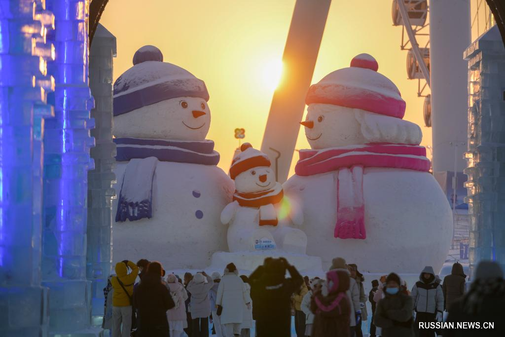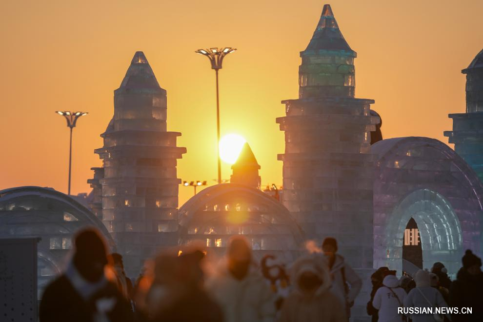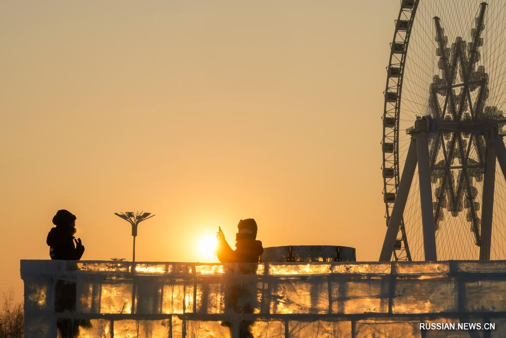 Харбин, 19 января /Синьхуа/ -- На закате туристы гуляют по парку "Большой мир льда и снега" в г. Харбин /адм. центр пров. Хэйлунцзян, Северо-Восточный Китай/.