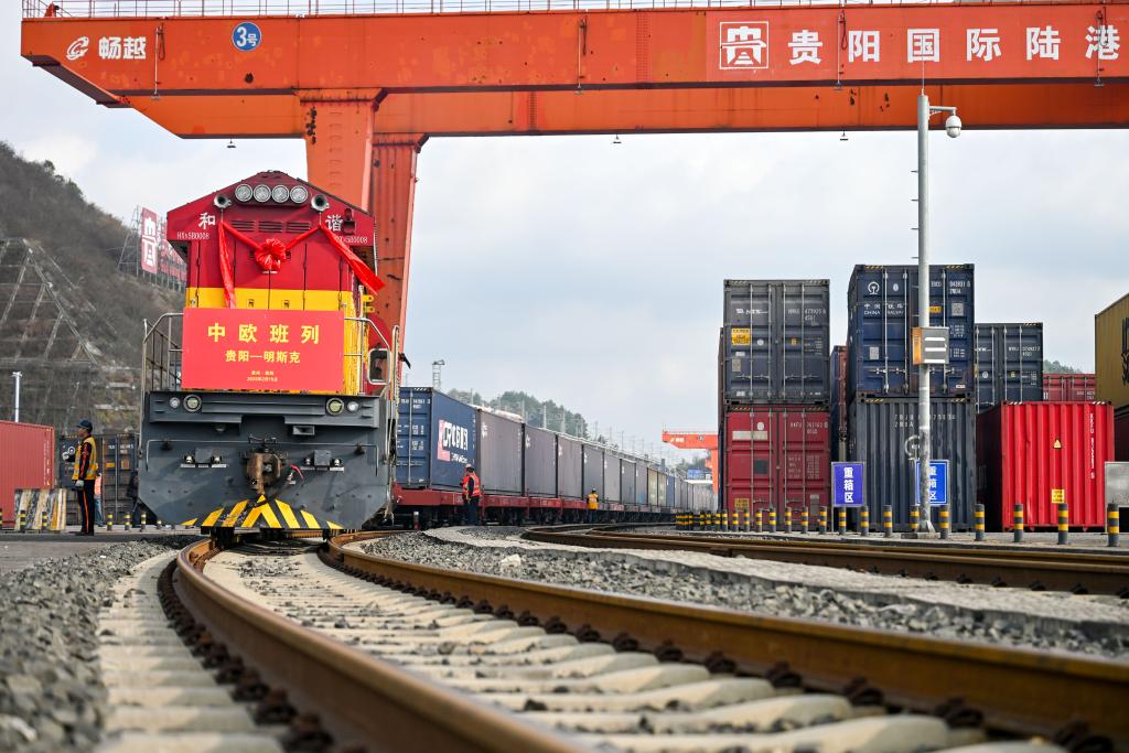 Гуйян, 16 февраля /Синьхуа/ -- В воскресенье в рамках международных железнодорожных грузоперевозок Китай-Европа из города Гуйян /адм. центр пров. Гуйчжоу, Юго-Западный Китай/ был запущен первый в провинции Гуйчжоу с начала 2026 года грузовой поезд. Состав, перевозящий 55 стандартных контейнеров /TEU/ с автомобилями на новых источниках энергии и автозапчастями местного производства, прибудет в Беларусь.
