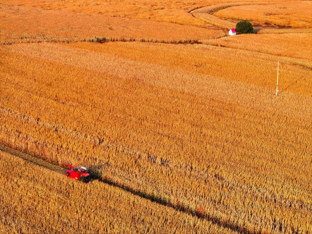 Фермер управляет комбайном по уборке кукурузы в поселке Фэнтянь района Хорчин города Тунляо Автономного района Внутренней Монголии (снято 14 октября 2025 года, фото с беспилотника). В период 14-й пятилетки общий объем производства зерна вырос с 685 млрд кг в 2021 году до 715 млрд кг в 2025 году, два года подряд уверенно превышая отметку в 700 млрд кг.