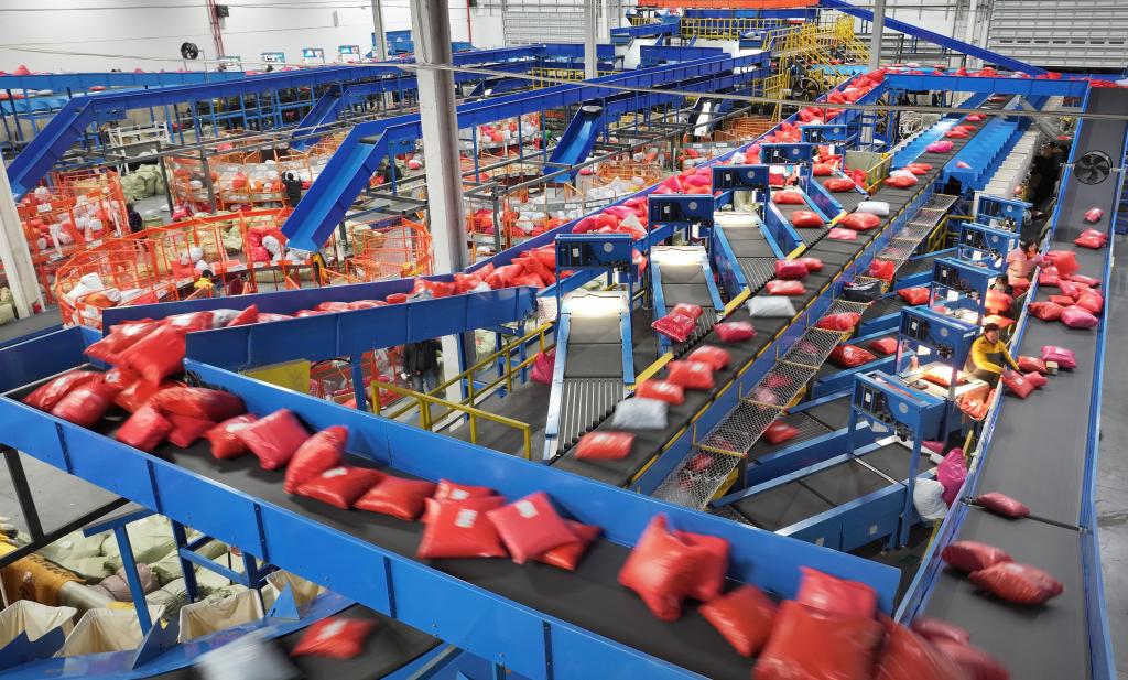 Сотрудники сортируют груз в распределительном центре международного логистического парка в Наньтуне провинции Цзянсу (снято 20 декабря 2023 года, фото с беспилотника). В период 14-й пятилетки, в условиях геополитических рисков и торговых барьеров, новые бизнес-модели, такие как трансграничная электронная коммерция, ремонт на таможенных складах и рыночные закупки, помогли потребителям и производителям «покупать и продавать по всему миру», став важным двигателем стабильности внешней торговли.
