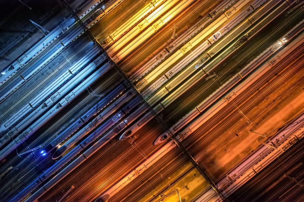 Поезда стоят в депо скоростных поездов Гуйянбэй (снято 6 января 2023 года, фото с беспилотника). В период 14-й пятилетки в Китае была создана крупнейшая в мире и самая передовая сеть высокоскоростных железных дорог.