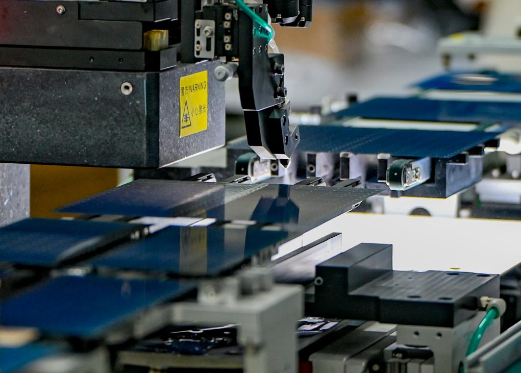 Автоматический станок режет фотоэлектрические пластины на предприятии новой энергетики в уезде Жоцян Баянгол-Монгольского автономного округа Синьцзяна (снято 22 сентября 2025 года). В период 14-й пятилетки экспорт «новой тройки» товаров — электромобилей, фотоэлектрической продукции и литиевых батарей — в 2025 году приблизился к 1,3 трлн юаней, увеличившись в 3,5 раза по сравнению с 2020 годом.
