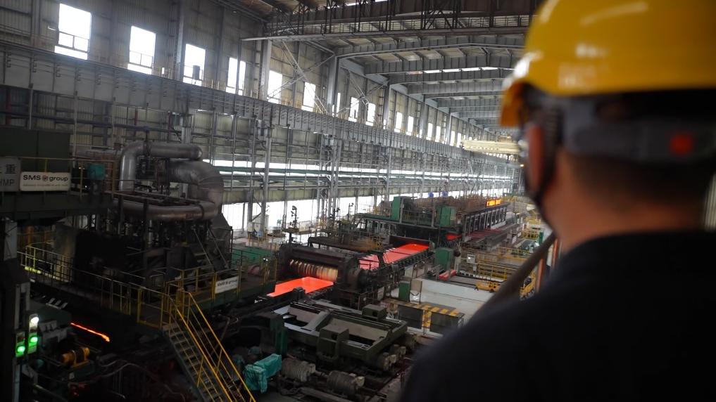 На участке горячей прокатки завода среднелистового проката компании «Шаньдун Айрон энд Стил Груп Жичжао» раскаленная стальная заготовка толщиной 150 миллиметров проходит через прокатный стан и после серии точных операций превращается в лист шириной 3250 миллиметров и толщиной 3,5 миллиметра.
