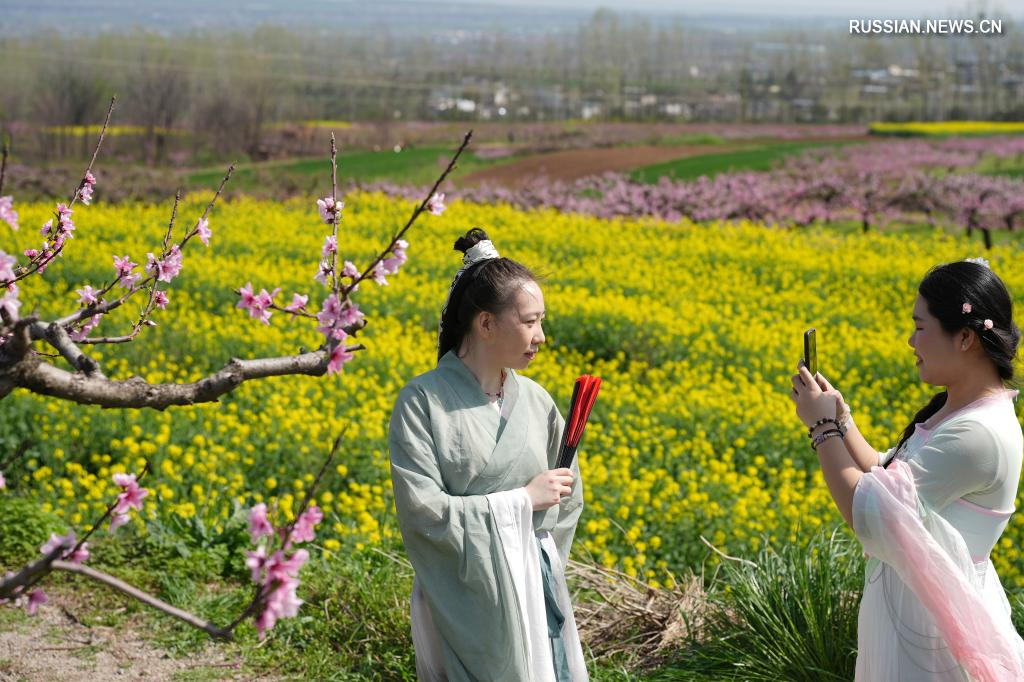 Сиань, 1 апреля /Синьхуа/ -- В настоящее время в районе Чанъань города Сиань /пров. Шэньси, Северо-Западный Китай/, расположенном у подножия горы Чжуннань в горной цепи Циньлин, цветут персиковые сады площадью более 6 800 му /примерно 447 га/. Различные культурно-туристические мероприятия, такие как поэтический салон в честь цветения персика, привлекают множество туристов, чтобы насладиться яркими весенними пейзажами.