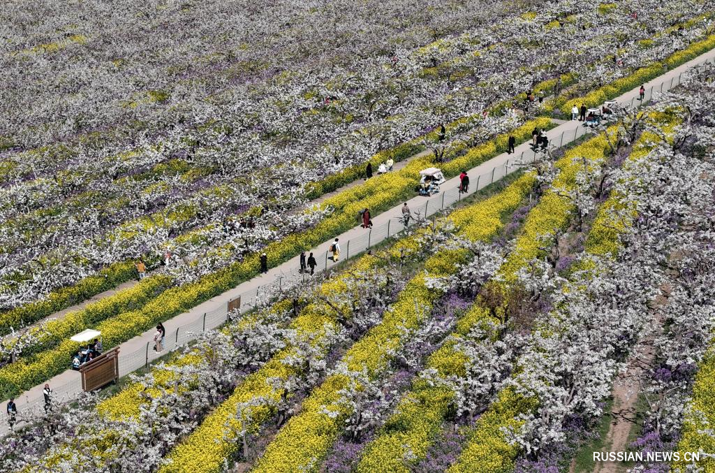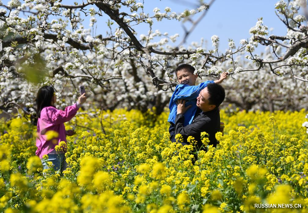 Шицзячжуан, 7 апреля /Синьхуа/ -- В окрестностях города Цзиньчжоу в провинции Хэбэй /Северный Китай/ на площади 10 тыс. га зацвела груша на фоне цветущих рапсовых полей. Этот живописный "мир цветов" привлекает множество туристов. Город Цзиньчжоу является одним из примеров развития сельского туризма, где активно используются такие факторы, как весеннее цветение.