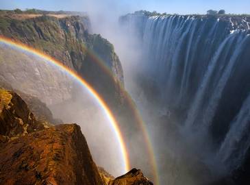 维多利亚瀑布,位于非洲赞比西河中游。宽1,700多米(5,500多英尺),最高处108米(355英尺),水流量大,为世界著名瀑布奇观之一。