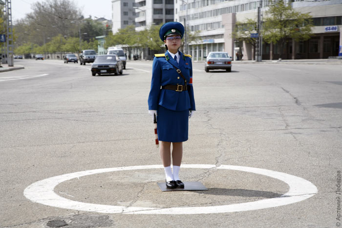 朝鲜马路上红绿灯是有的,但是大都不工作,主要靠女交警人工指挥交通。
