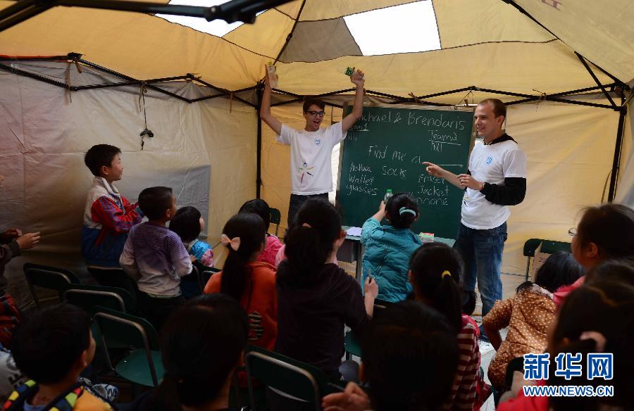 4月22日,来自西南财经大学的17名大学生志愿者在四川省芦山中学搭建起帐篷和课桌椅,为中小学生辅导功课。目前,芦山地震灾区的学校尚未复课。