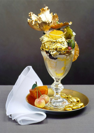 Ингредиенты: ванильное мороженое Таити, тосканский шоколад «Amedei Porcelana», шоколад «Chuao», карамелизированные парижские фрукты, трюфели, вишневый марципан, сладкая икра «Grand Passion», лист из 23-каратного золота