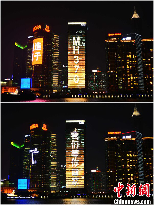 11 марта на огромном экране высотного здания, который расположен в финансово-торговой зоне Луцзяцзуй в районе Пудун в Шанхае, появились слова пожелания пропавшим пассажирам рейса MH370. На большом экране появились слова: «MH370, возращайтесь домой!».。