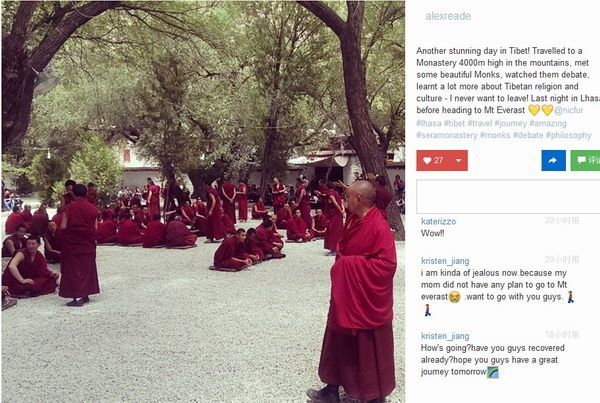 Интернет-пользователь под ником «alexreade» на английском языке опубликовал в своем аккаунте в «Instagram»: «Провел в Тибете еще один потрясающий! Мы побывали в монастыре на высоте 4000 метров над уровнем моря и встретились с монахами. Увидели, как они дебатируют согласно канонам, узнали много о тибетской религии и культуре. Я не хочу уезжать! Сегодня последняя ночь в Лхасе. Завтра отправляюсь на Чжомолунгму (Эверест).»