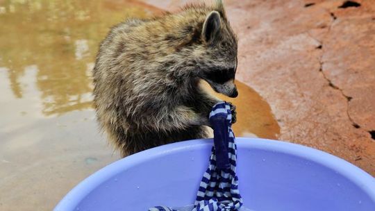Зоопарк назвал енотов «ударниками труда». На снимках: еноты стирают одежду.