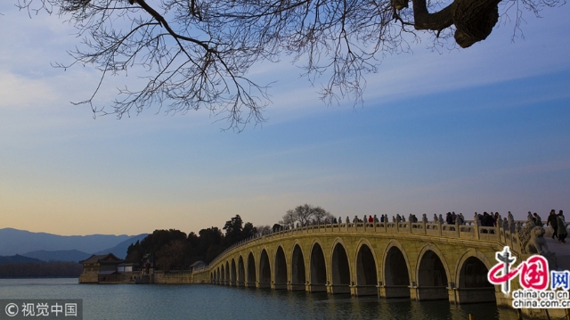 На днях в парке Ихэюань в Пекине легкие облака и ветерок, солнечная погода, лед на озере Куньминху постепенно тает. Кажется, приближается весна. К вечеру в парке Ихэюань очень тихий и прекрасный вид.
