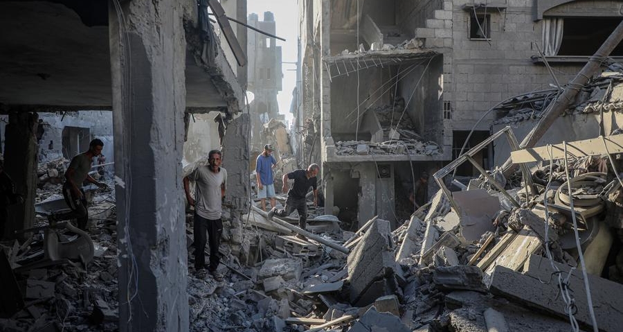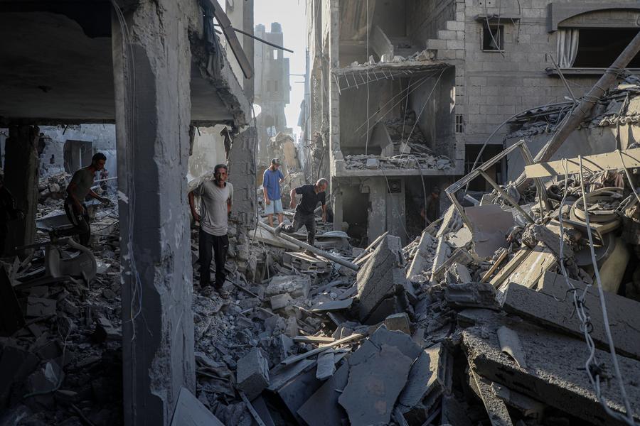 27 июня, Газа. Палестинцы среди обломков зданий, разрушенных в результате израильского удара. /Фото: Синьхуа/