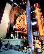В середине Большого зала совершают жертвоприношения статуе Будды Шакьямуни высотой 9,1 метра. Ее высота с постаментом -- 19, 6 метра. Статуя Будды вырезана из 24 брусков камфарного дерева. Все части статуи Будды пропорциональны, у него доброе выражение лица, степенная фигура. Статуя позолочена и издает яркое сияние. Набожные паломники, поставив курительные свечи, падают ниц перед нею.