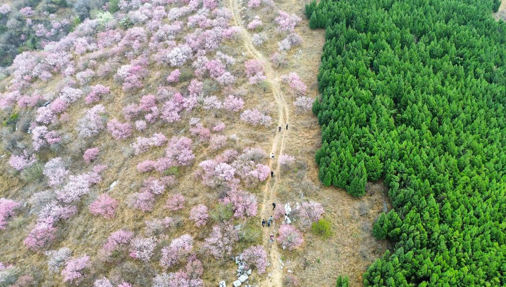 Цзыбо, Шаньдун: розовые персики и зеленые сосны создают весенний пейзаж в горах