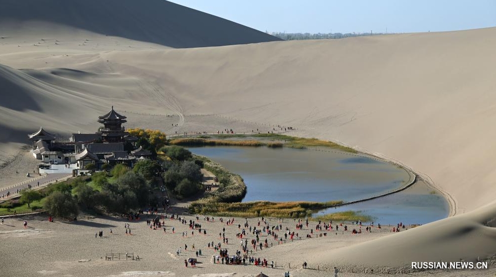 Осенний пейзаж в пустыне под городом Дуньхуан на северо-западе Китая