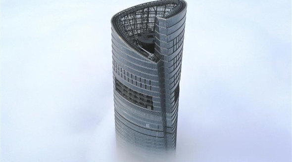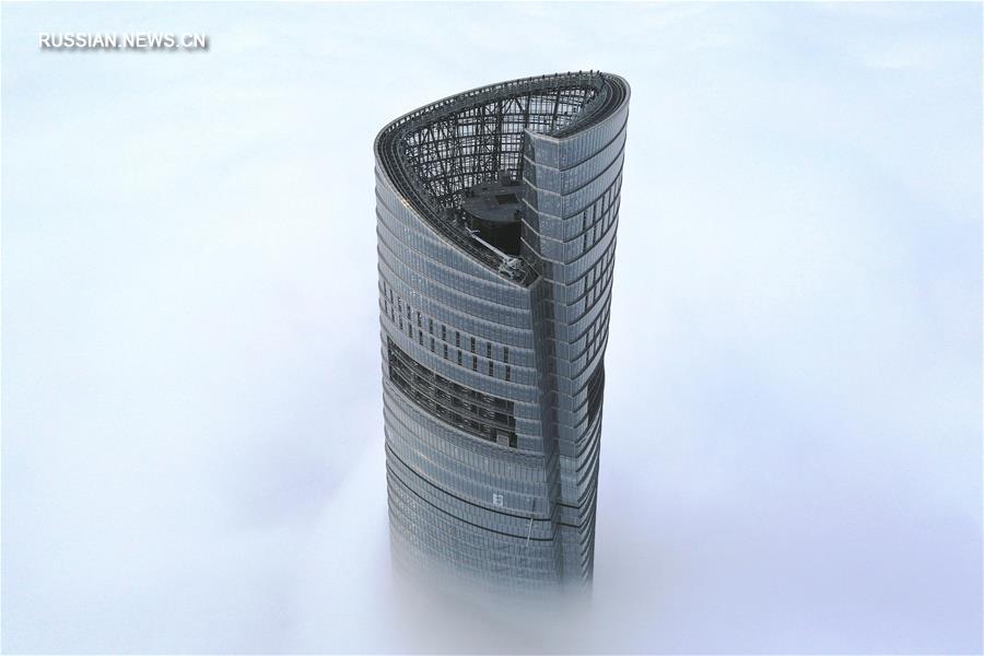 Шанхай, 19 апреля /Синьхуа/ -- На фото -- окутанная пеленой густого тумана Шанхайская башня. Фотографии Синьхуа/Шэнь Чуньчэнь