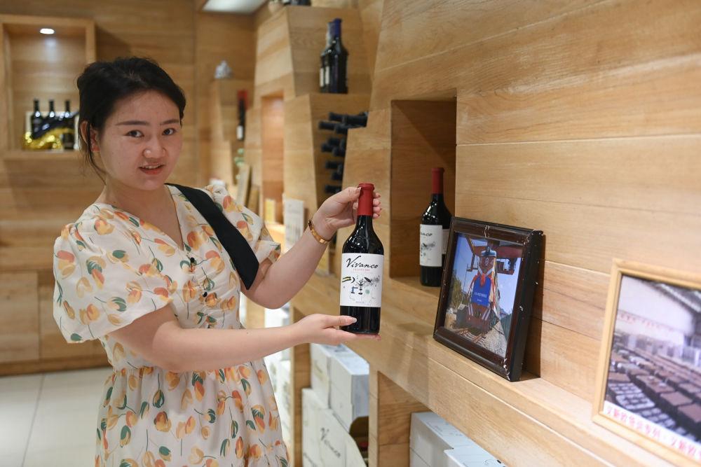 18 июля продавец в международном торговом центре Иу демонстрирует испанское красное вино, импортированное рейсом «Исиньоу». Фото корреспондента информационного агентства «Синьхуа» Хуан Цзунчжи.